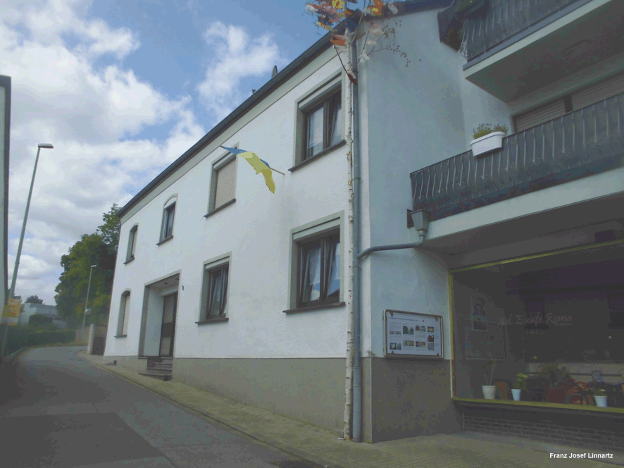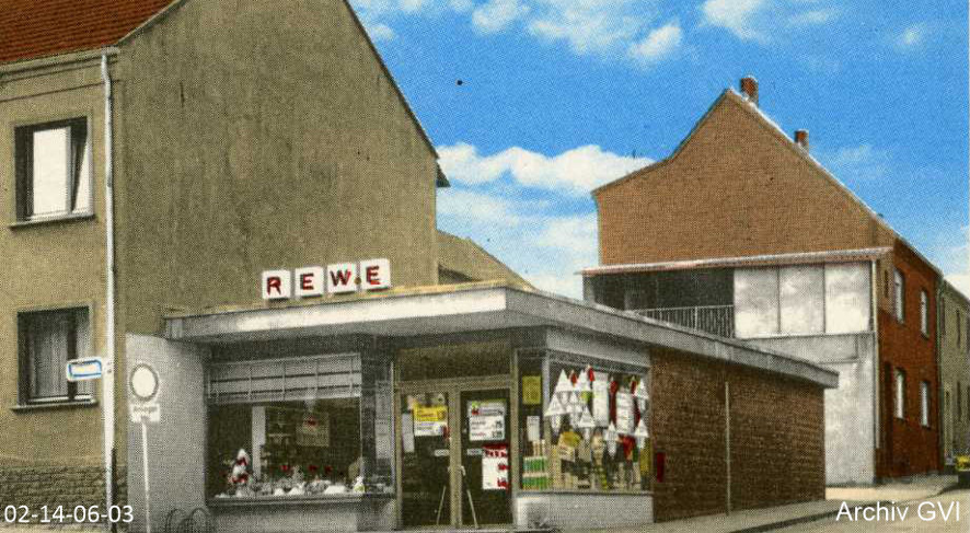 Là où se trouve dès Janvier 1995 au site de ce panneau le glacier Roma (Mariotti), les époux Franz et Vera Dolfen ont dirigé une épicerie (REWE) dans les locaux, de 1968 à 1993, dans le style d’un self-service avec une boulangerie supplémentaire, que Franz Dolfen avait repris de Karl Struck.