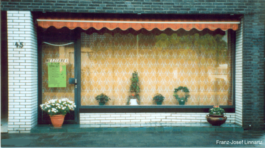 La photo de gauche, avec vue en direction de l’Oberstraße/Feldgasse, montre le magasin devant à droite en 1950, la photo de droite dans les années 80 avec Mme Nowaczinski dans la vitrine.