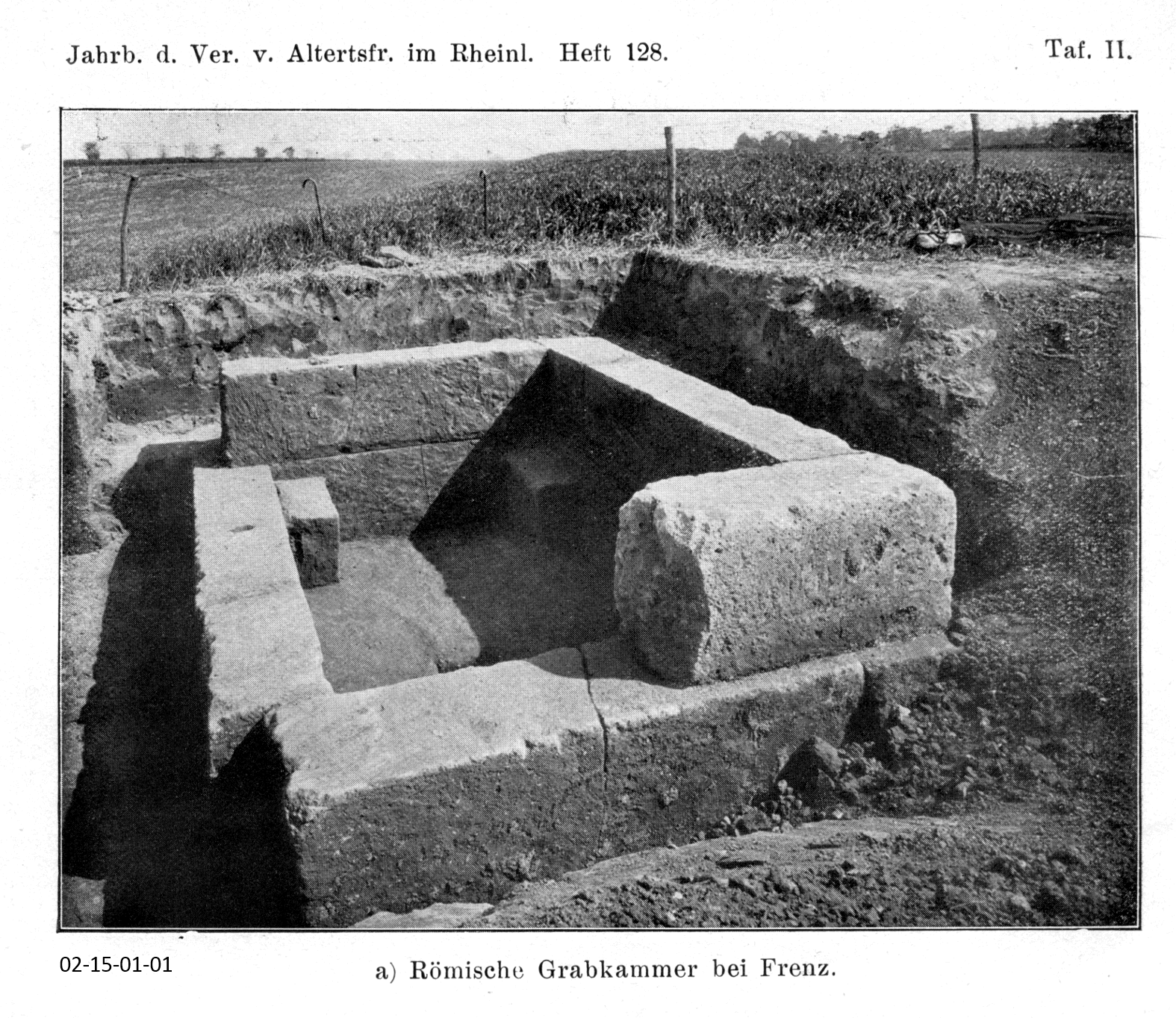 Im April 1921 stieß man bei Wegearbeiten in der Nähe der Landstraße Eschweiler- Jülich auf ein römisches Gräberfeld. Neben einem Skelettgrab konnten vor allem noch Reste von zwei größeren Grabdenkmälern freigelegt werden.