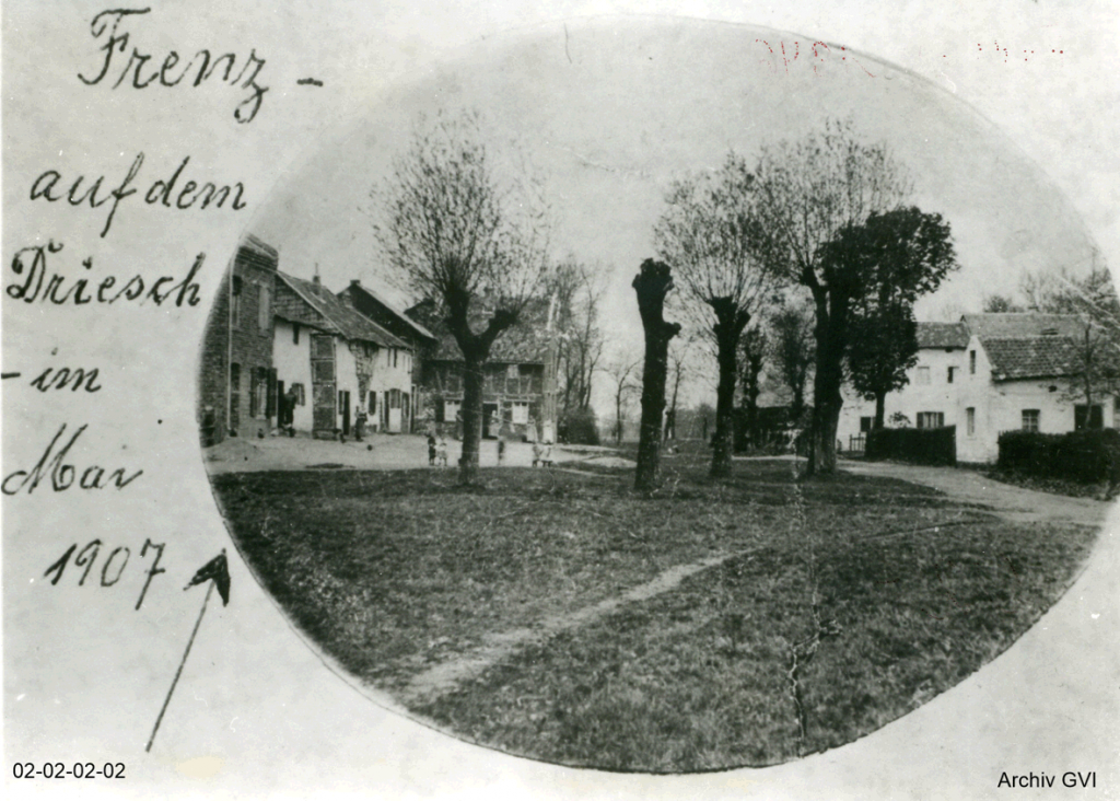 Betrachtet man die geografische Lage des Ortsteiles „Frenzer Driesch“, so könnte man annehmen, das dieser nicht zum eigentlichen Ort gehören würde, wird er doch durch den Verlauf der Inde vom „Hauptort“ abgetrennt und ist nur über die Brücke zu erreichen.