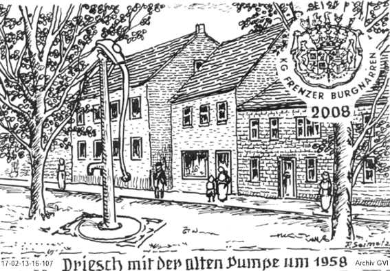 Dazu gehörte auch eine Wasserstelle, ein Brunnen oder eine Pumpe, die sich in der Mitte dieses Ortsteils befand, wie auf einer Kachel der Karnevalsgesellschaft Frenzer Burgnarren zu sehen ist.